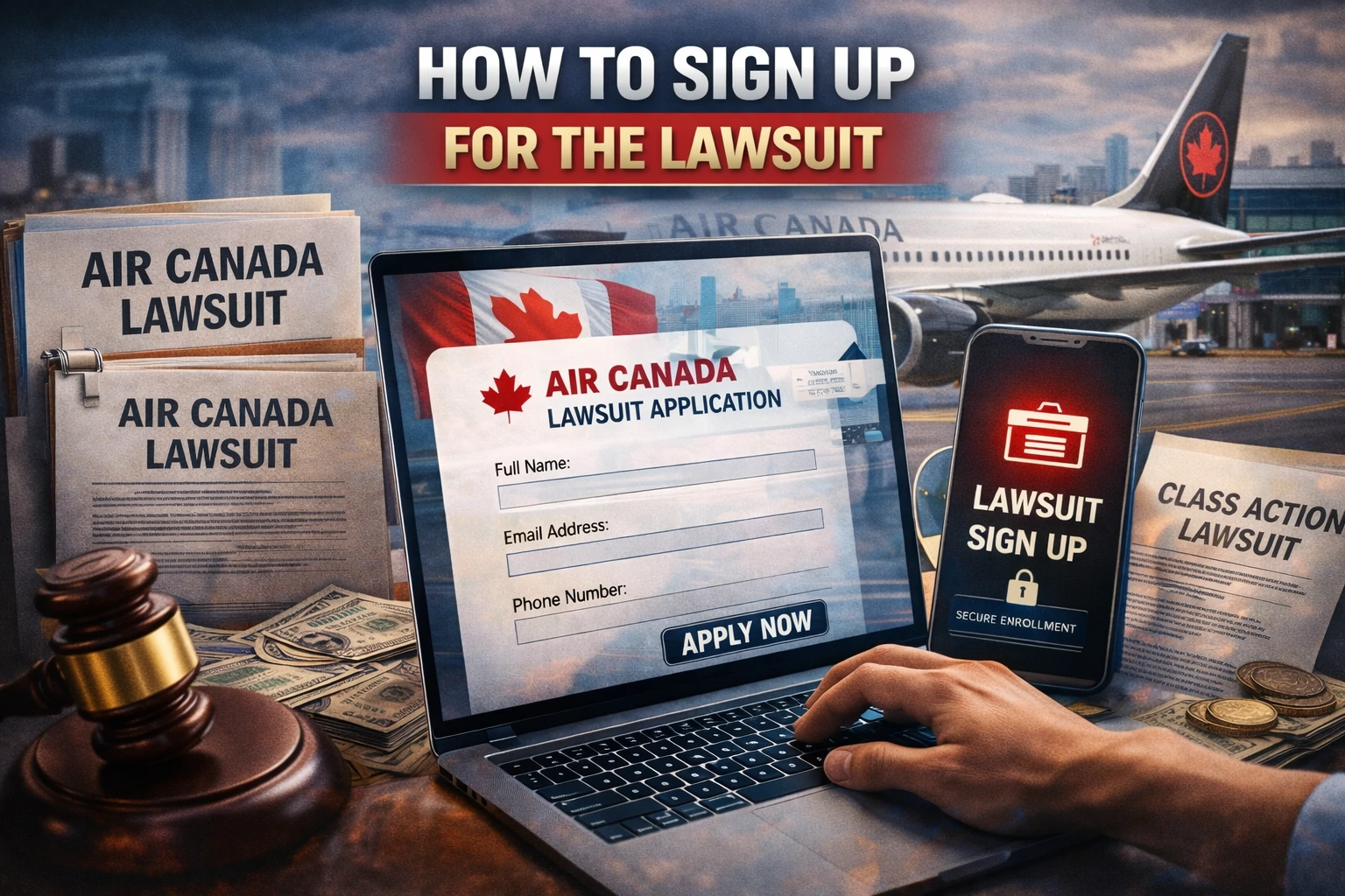 Person filling out legal claim form with Air Canada plane, gavel, and courthouse in the background