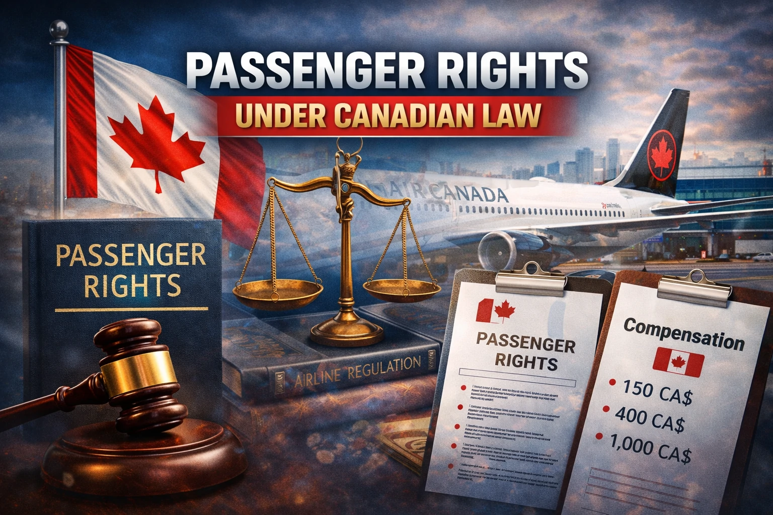 Scales of justice, Canadian flag, Air Canada plane, and passenger rights book representing airline compensation laws